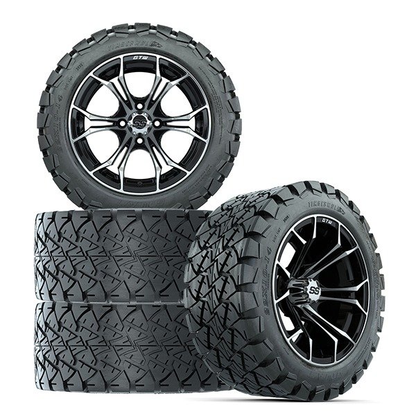 - 4 x 12″ Vampire Black/Machined Aluminum Golf Cart Wheels mounted on